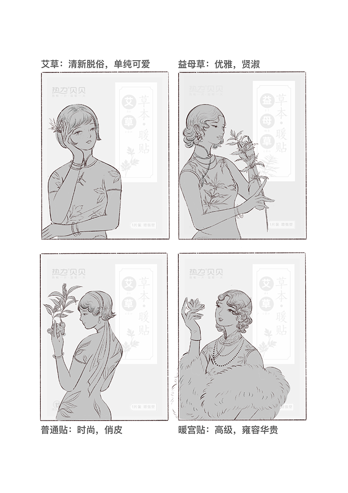 The illustrations for the package of the Chinese herbal warming patch products. I created characters to represent different herbs and designed unique female characters based on the color and benefits of each herb.