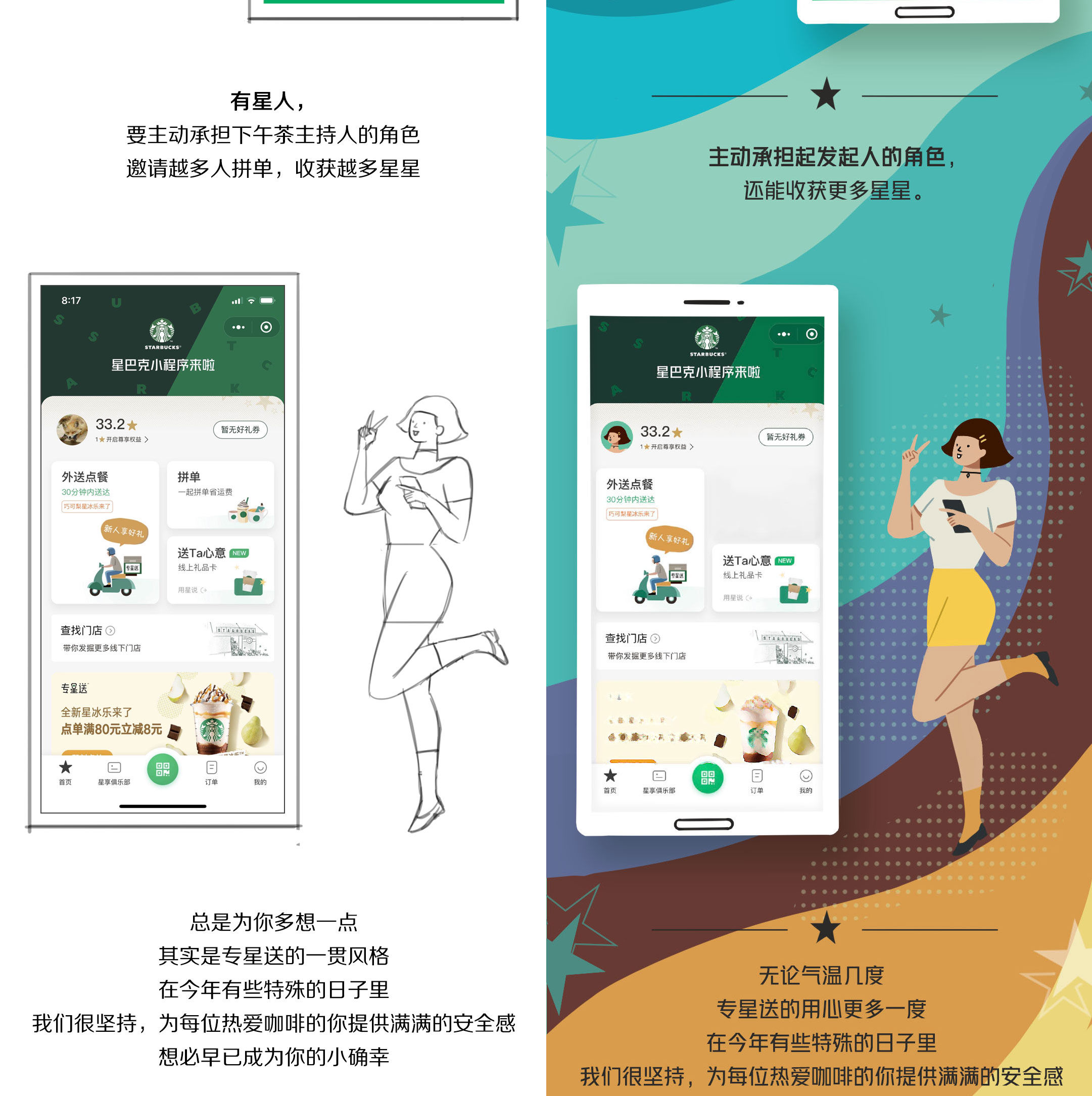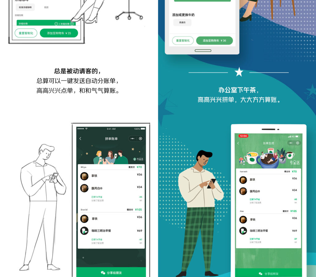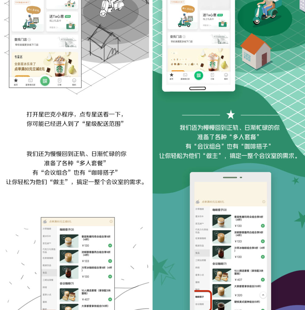 This is a promotional campaign for Starbucks, showcasing the new group ordering feature on their online platform. The project consists of a long-format illustration designed for mobile articles on WeChat, a popular Chinese social media platform.