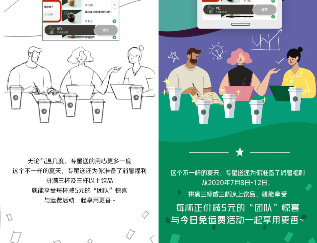 I used a simple, vector style with a green background and colorful characters and scenes, matching Starbucks’ clean and modern look while staying true to their brand.